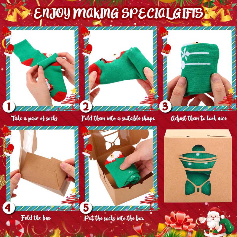 - All Inclusive Christmas Gifting: indulge in effortless Christmas gifting with 100 pairs of vibrant Christmas socks(20 styles) and 100 charming kraft paper boxes with window(6 styles), ensuring varied styles and ample quantities for a special gifting experience;