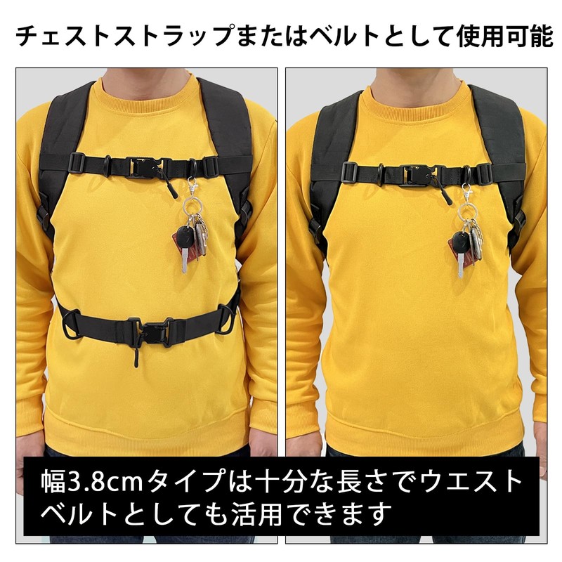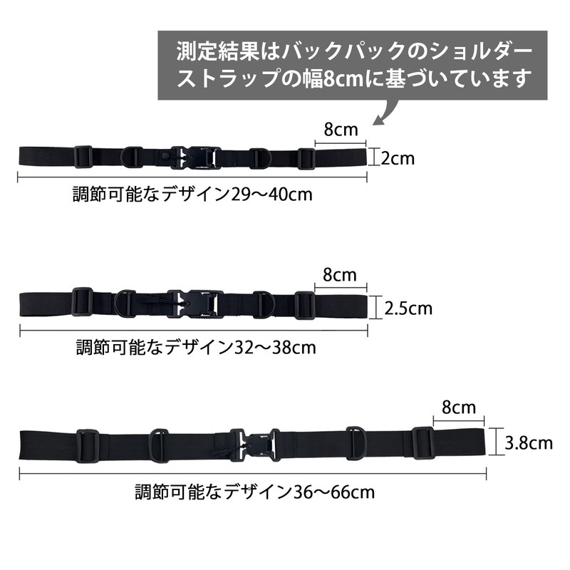 - Adjustable Chest Strap: Width 0.8 inches (2 cm); Length 11.4 - 15.7 inches (29 - 40 cm); Width 1.0 inches (2.5 cm); Width 12.6 - 15.0 inches (32 - 38 cm); Width 14.2 - 26.0 inches (36 - 66Provides a comfortable fit and adapts to any backpack Suitable for kids and adults The 1.5 inch (3.8 cm) wide type is long enough to be used as a waist belt