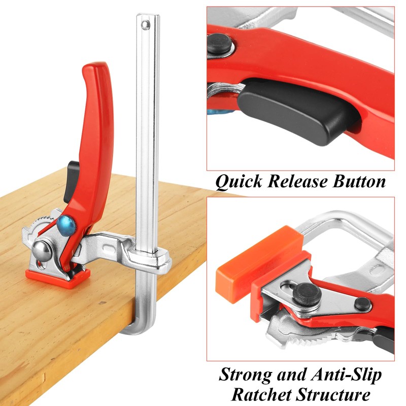 • Package Includes: You will receive 2pcs ratcheting table clamps, each quick ratcheting clamp with 6.3" Max Opening, 2-3/8" Throat Depth, It can provide the 353lbs force