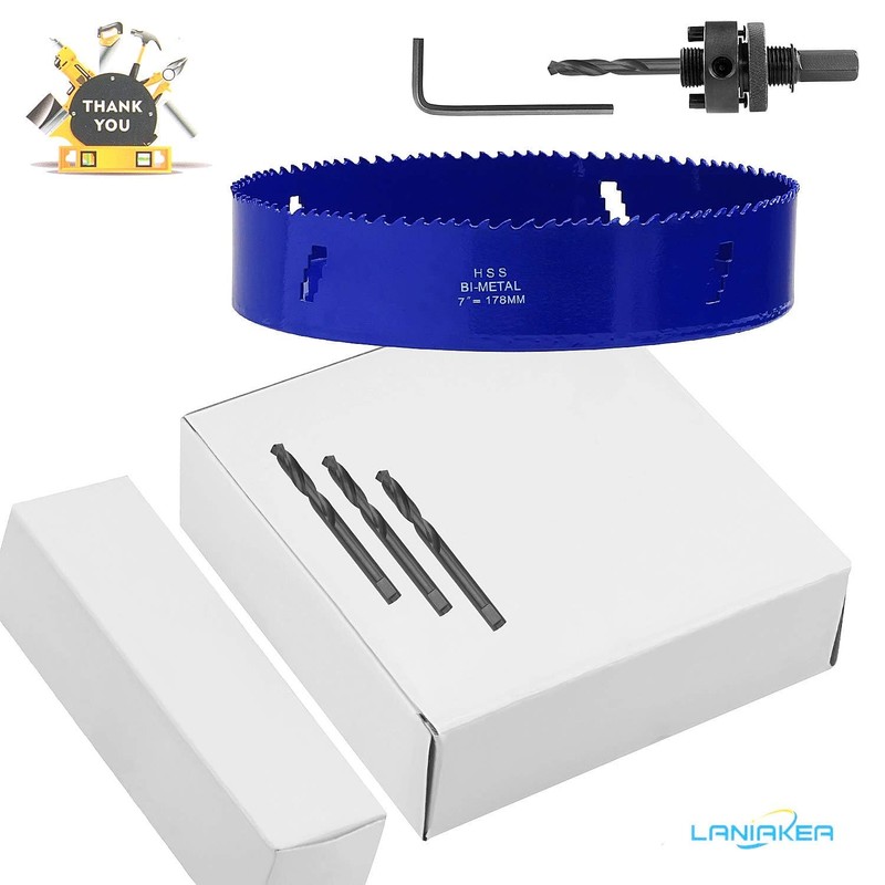 LANIAKEA 7 Inch Bi-Metal Hole Saw 178MM M42 Annular Hole Cutter HSS Variable Tooth Pitch Holesaw Set with Arbor Blue for Cornhole Board Wood Metal Plastic Fiberboard