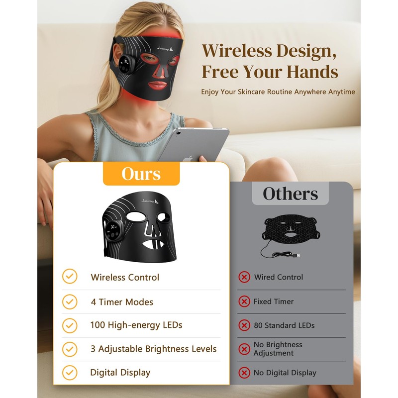 - 400 High-Energy LEDs: This red light therapy for face equipped with 100*4 sets high-energy LEDs for full-face coverage, it delivers uniform light distribution with enhanced energy output for deeper absorption, effectively helping address skin concerns and supports skin's natural vitality