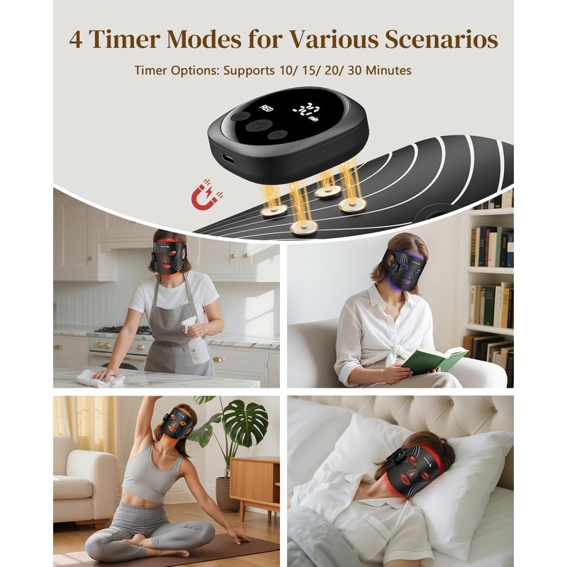 - Customizable Timer Settings: This led face mask defaults to a 10-minute session, but you can customize it to 15, 20, or 30 minutes based on your needs. It automatically shuts off when the time is up. For optimal results, we recommend using it for 10-20 minutes per day and 3-4 times a week