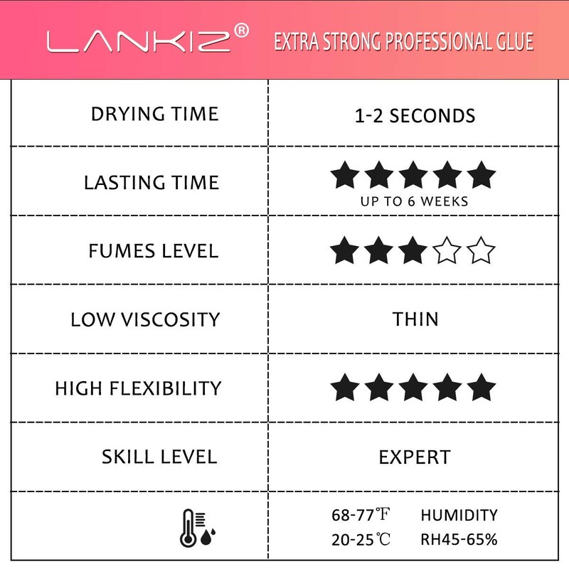 - ♥ CONVENIENT DESIGN & ALWAYS STAND YOUR BACK: LANKIZ put the customers at first. We designed in a sealed package that has silica gel alongside a glue needle that keeps the eyelash extension glue fresh for longer periods. If you are not totally satisfied with LANKIZ eyelash glue please feel free to contact us, we always here.