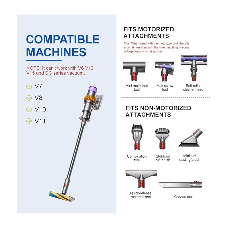 • Wide Compatibility: This flexible vacuum hose is compatible with Dyson V7, V8, V10, and V11 series cordless vacuums (NOTE: !!!NOT FIT!!! DO NOT work with V6, V12, V15, Gen5 or DC series.!!!NOT FIT!!!)