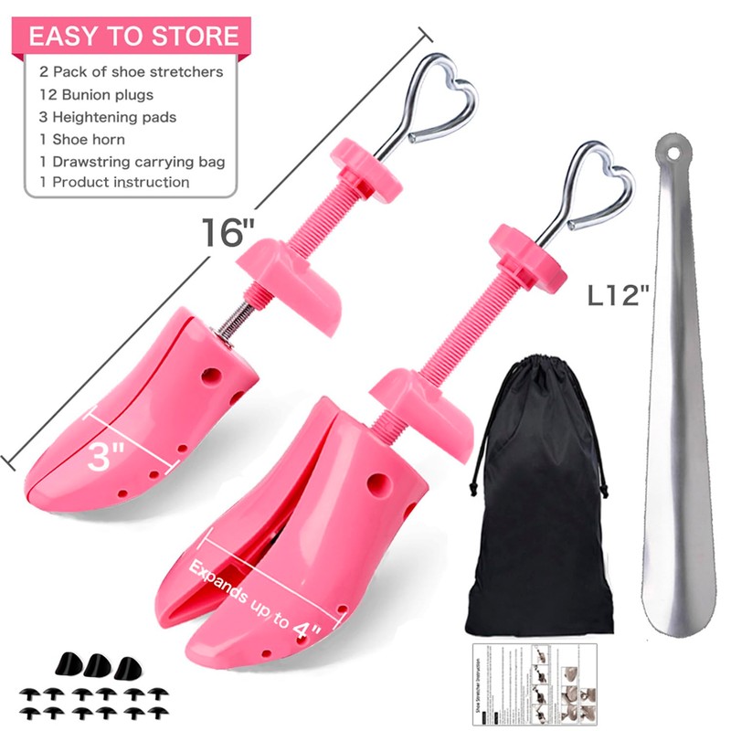 - 【IDEAL GIFT CHOICE】There comes with set of 2 shoe stretchers, 12 bunion plugs, 3 heighten pads and 1 shoe horn, packaging in a carrying bag. Shoe expanders are an ideal gift choice for your family or friends for Thanksgiving Day, Christmas Day, Mother Day. The shoe stretcher men is backed by satisfaction guarantee. If you have any issue with the shoe stretchers, just contact us and we will reply promptly.