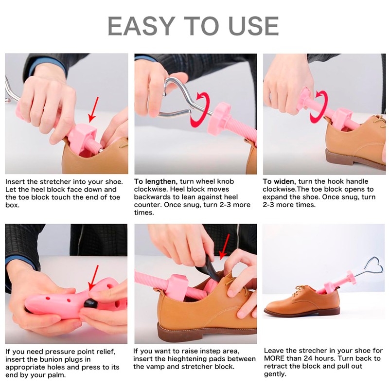 - 【SIMPLE STEPS, EASY TO USE】Insert shoe stretcher into your shoes. Turn the metal handle in clockwise to widen the toe box. Turn the wheel knob in clockwise to lengthen the shoe. Insert the bunion plugs in appropriate holes to stretch specific areas. Insert the heightening pads to adjust the shoe vamp. Leave the shoe stretchers in the shoes more than 24 hours. And that’s all of it. The shoes stretcher men for wide feet will convince you that how quickly you could get new shoes hit the road.