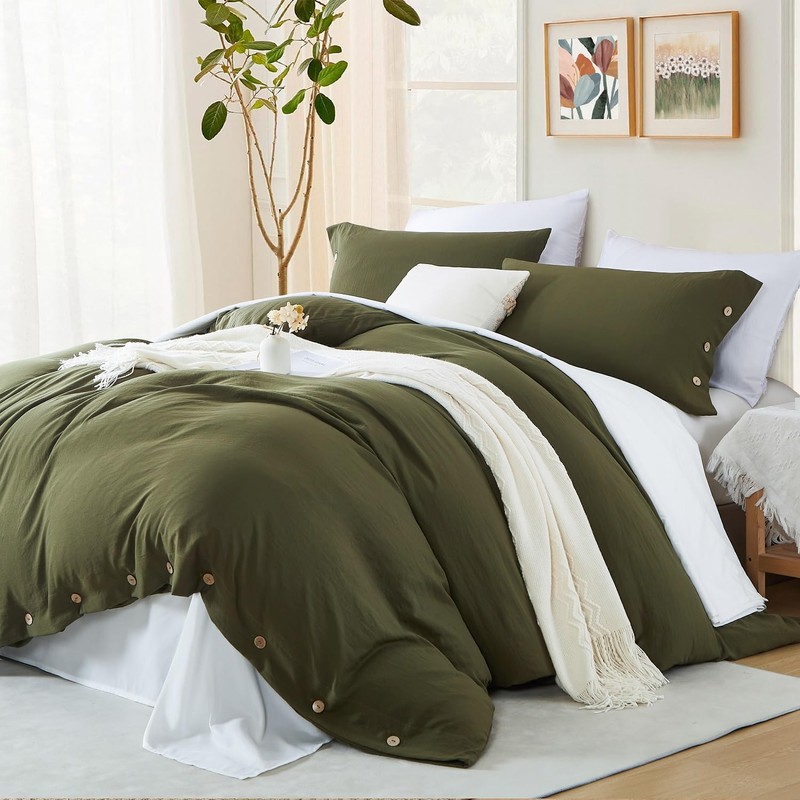 - Package includes: 1 duvet cover 155 x 220 cm + 1 pillowcase 80 x 80 cm, olive green bed linen set, we have included additional buttons for replacement. The bed linen and pillowcases are tested for harmful substances according to Oeko-Tex Standard 100.