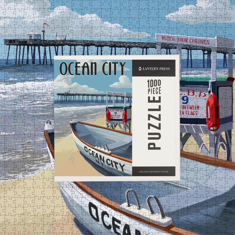 - 18.5 x 27.75 inches Lantern Press 1000 Piece Jigsaw Puzzle, Ocean City, New Jersey, Lifeguard Stand and Boat