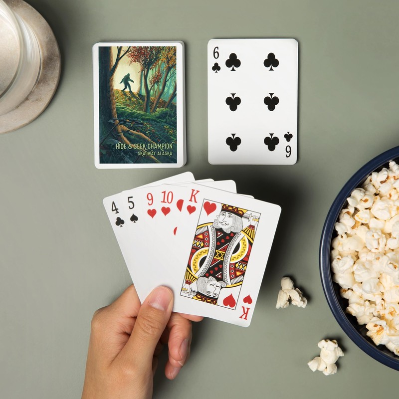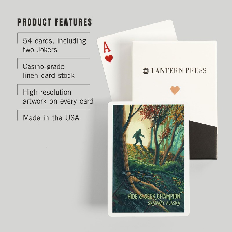 High-quality playing cards from Lantern Press, with unique artwork of Skagway, Alaska, Hide and Seek, Wanderer, Bigfoot in Forest (52 Playing Cards, Poker Size Card Deck with Jokers).