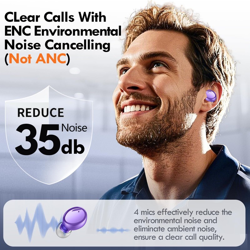 Lanteso True Wireless Bluetooth 5.3 Earbuds, 48H Playtime,Light Weight Headphones in Ear Buds Built in Mic Headset Premium Sound with Deep Bass,Clear Calls Earphones for Sports Workout Purple