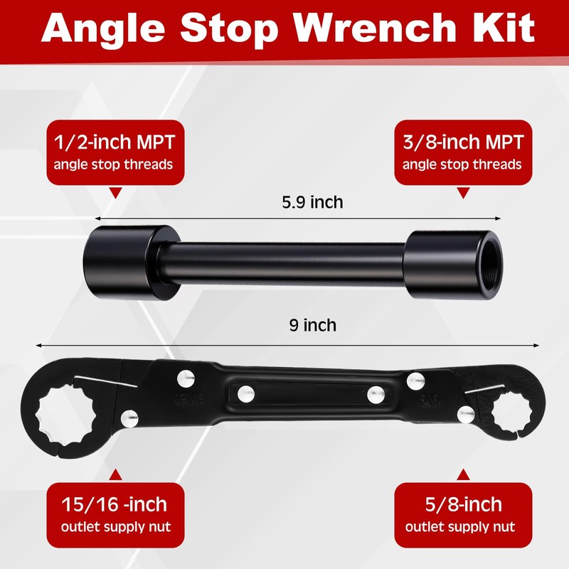 - Angle Wrench Kit: made of materials with a corrosion resistant surface, this wrench ensures long lasting reliability and performance for all plumbing projects, while being lightweight and easy to carry around; The plumber's wrench kit can be applied to install new compression angle stops, remove and replace tightening angle nut stops, and can be applied in a variety of plumbing applications, convenient and flexible