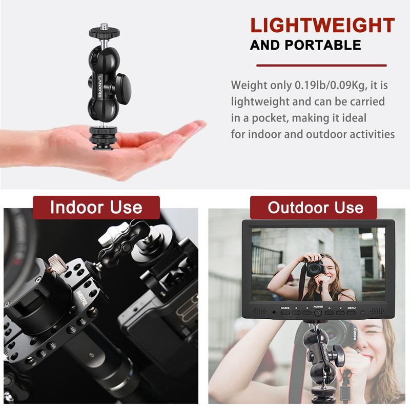 - 【VERSATILE MOUNTING】 Equipped with a 1/4’’ standard screw, this ball head is the perfect solution for mounting photography accessories such as video lights, ring lights, field monitors, flash lights, and other accessories with 1/4’’ screw.