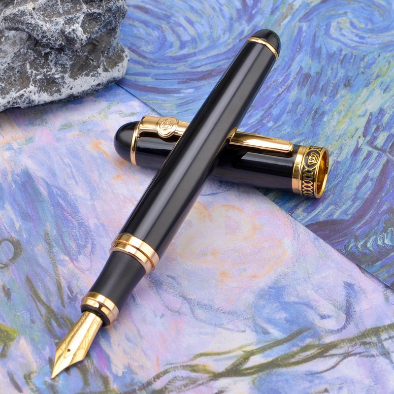 Lanxivi Duke D2 Fountain Pen Black Gold Trim Fine Nib with Additional Fude Nib (Bent Nib) and Converter Calligraphy Art Pen Set