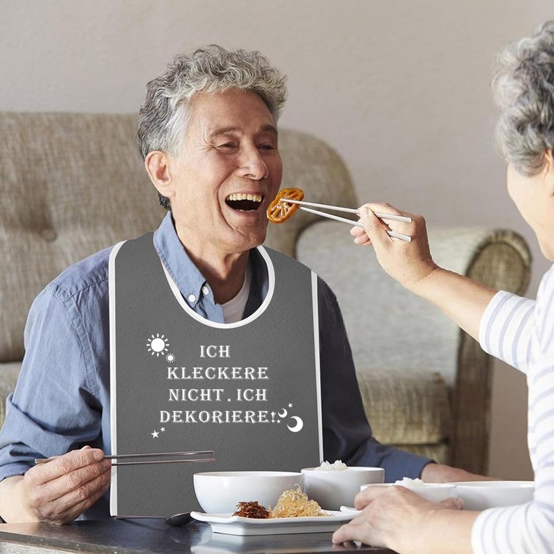 - Einzigartiges Design: Diese Latz für Senioren ist mit dem humorvollen Spruch "ICH KLECKERE NICHT, ICH DEKORIERE“ bedruckt und in einem stilvollen Grau-Weiß gehalten. Die Kleiderschutz für Erwachsene verdeckt geschickt Verschüttetes und Flecken und bringt Leichtigkeit und Spaß in die tägliche Mahlzeit