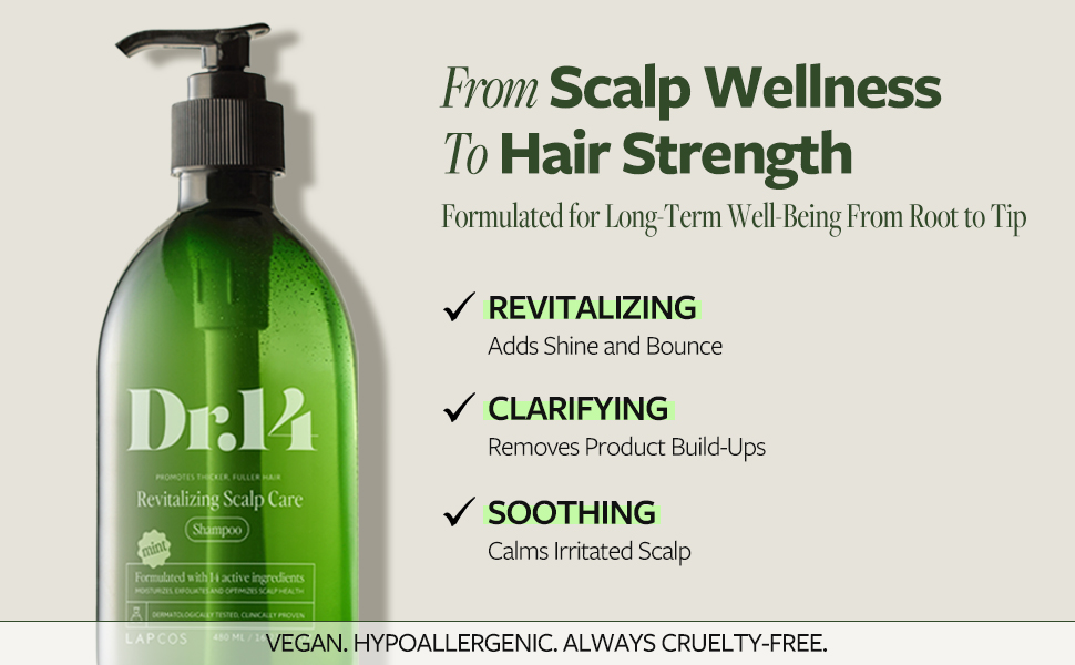- Dr. 14 Scalp Care Shampoo is back with a new look and refreshed, vegan formulation! Made with 14 high performing active ingredients, this daily shampoo and hair thickening scalp treatment targets multiple underlying factors of hair health.