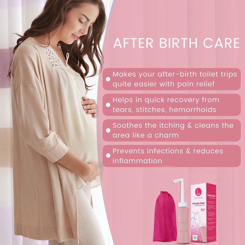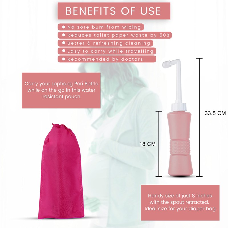 Product Specification Material: PP+TRB Color: Pink Size: 500ml Pack of 1 Laphang post birth essentials is the perfect use for woman struggling with stitches and infections in their perineum after normal delivery or C-section. Our portable bidet spray bottle can be carried in its pretty waterproof travel bag with the cap on its spout to avoid spilling when filled with water. It helps relieve postnatal pain. The 500ml peri wash bottle is made inside of PP and outside of TBR which makes it los-lasting. Bidet sprayer is leak proof and scratch residence. Postpartum essentials are a perfect use for those who are suffering from fistulas, hemorrhoids or piles. Save your money with after birth essentials for mum which is a good alternative to toilet paper. With after birth essentials you will get the perfect fair sum of water, intense or soft depending on how hard you squeeze. So, what are you waiting for buy our pregnancy bottle you will like it for sure.