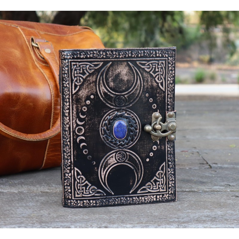 A5 Black Triple Moon Journal with Lapis Lazuli stone, crafted from 100% pure leather