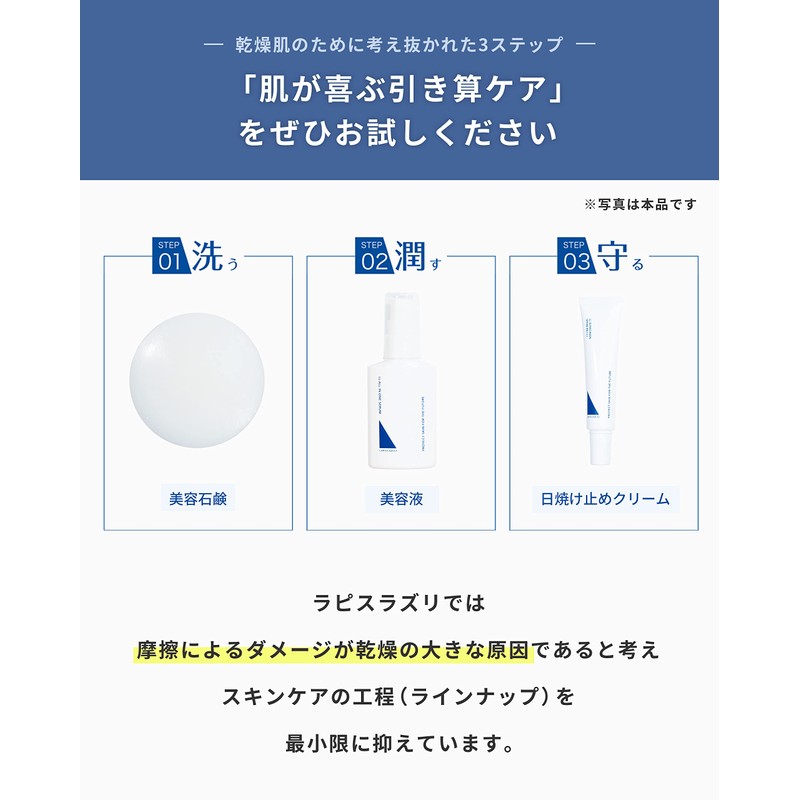 - 3 Day Trial Set: This is a great value trial set that can be used for dry skin with 3 step care by the simple skin care brand Lapis Lazuli