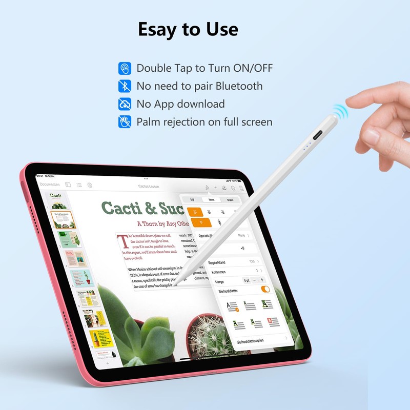 • Lápiz óptico activado táctil: pulsa un botón para comenzar, sin necesidad de Bluetooth y aplicación. Simplemente toca la parte superior del bolígrafo digital para encenderlo y apagar; en el estado de encendido, el lápiz capacitivo mostrará la energía restante de la batería en tiempo real a través de 3 luces indicadoras.