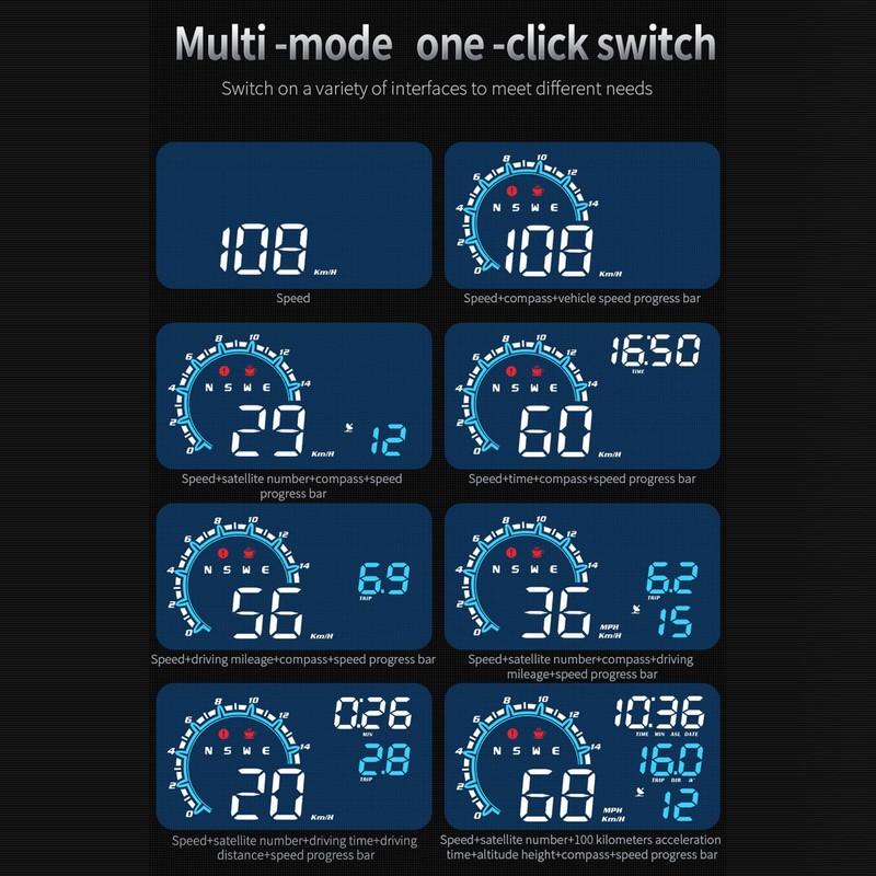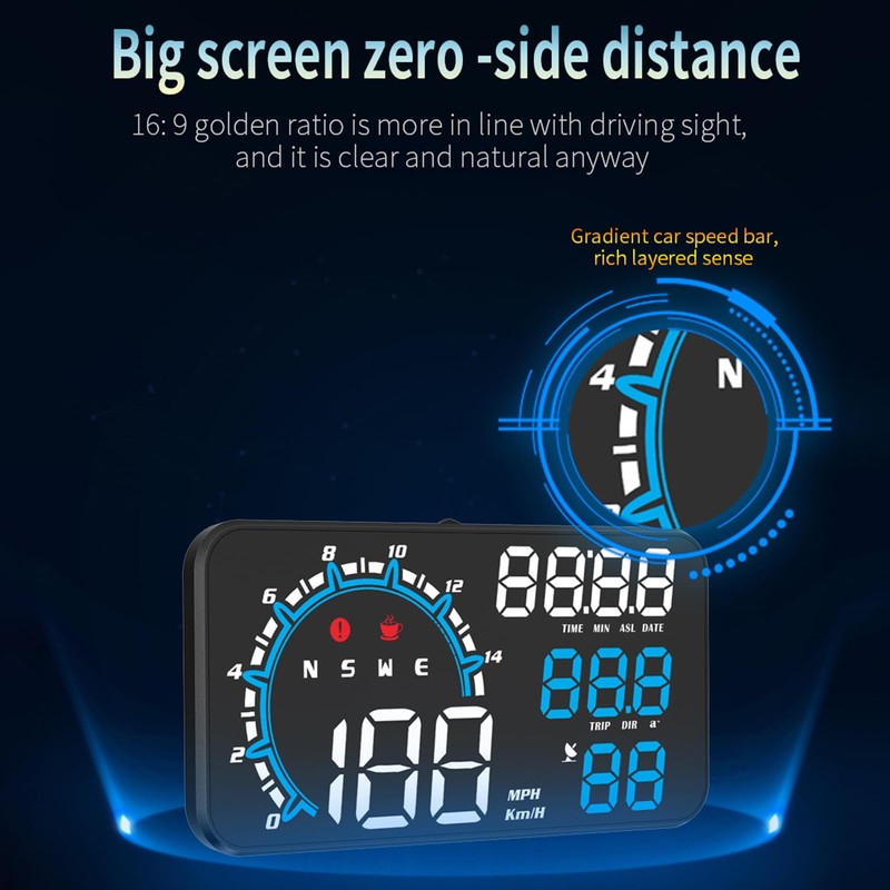• Multi-Function Display: The head up display has multiple display functions, including speed, speed progress bar, driving direction, driving time, clock, altitude, and other information, which meets the needs of drivers.