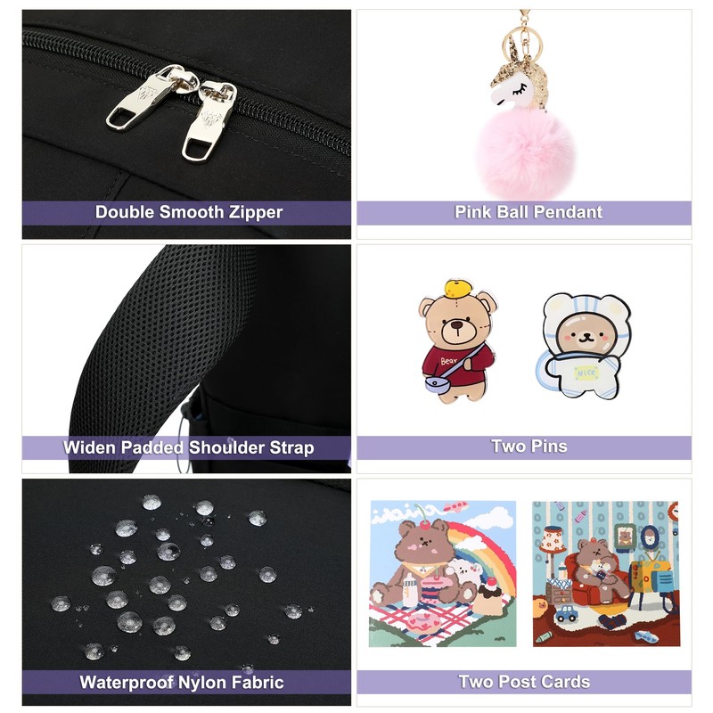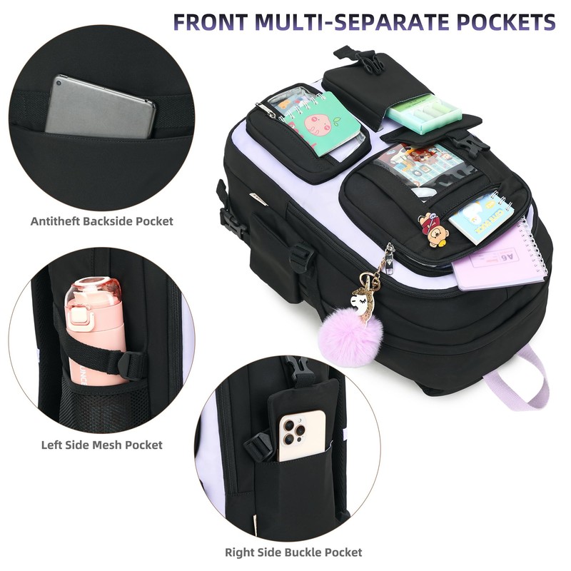 Laptop Backpacks 16 Inch School Bag College Backpack 3 PCS with Lunch Box Pencil Pouch Set Large Travel Daypack Kawaii Bookbags for Teens Girls Women Students (Black Purple)