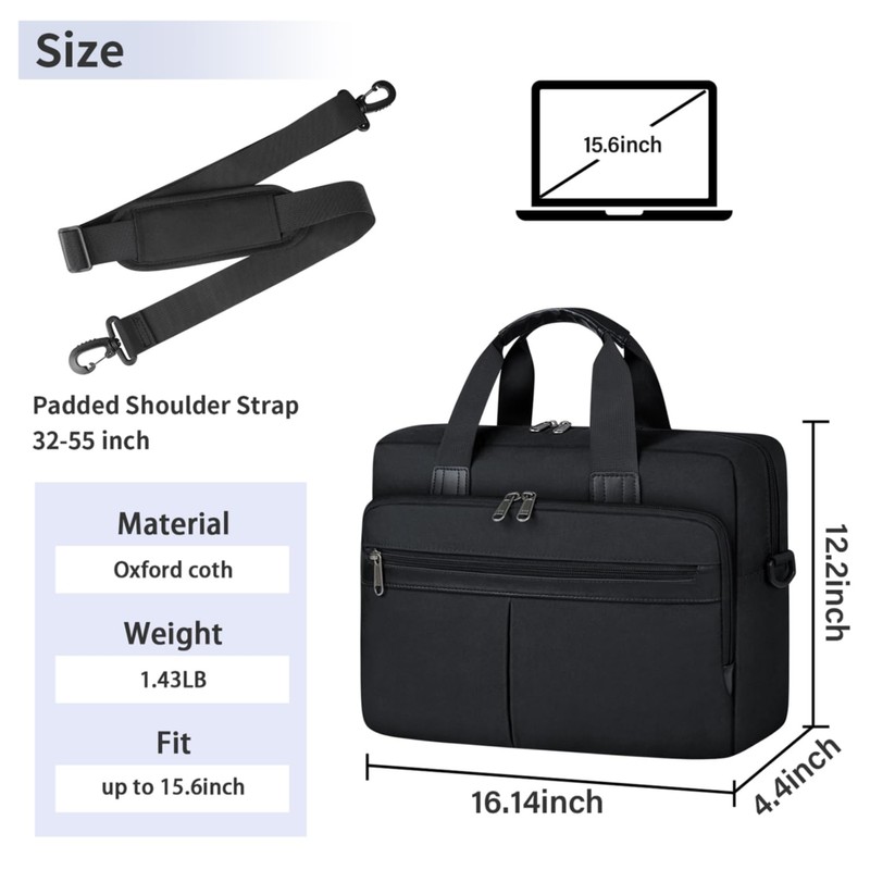 - 【Large Capacity】Dimension of laptop bag: 16.14 x 4.7 x 12.2in(L x W x H). This roomy laptop bag has plenty of room to storage your daily items. 1 large compartment for your books, documents, magazine. 1 padded laptop compartment fits up to 15.6 inch laptop. 2 front zippered pocket for easy access to your phone, keys, wallet, pens etc.