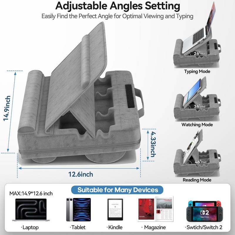 - Adjustable Angle: This laptop lap pad has dimensions of 14.9 inches (length) × 12.6 inches (width), perfectly fitting laptops, tablets, iPads, Kindles, and magazines of 14.9 inches and smaller. Lap desk for laptop features three adjustable angles (26°, 36°, and 46°) to meet the needs of typing and reading at different angles. It's the ideal lap desks for adults.