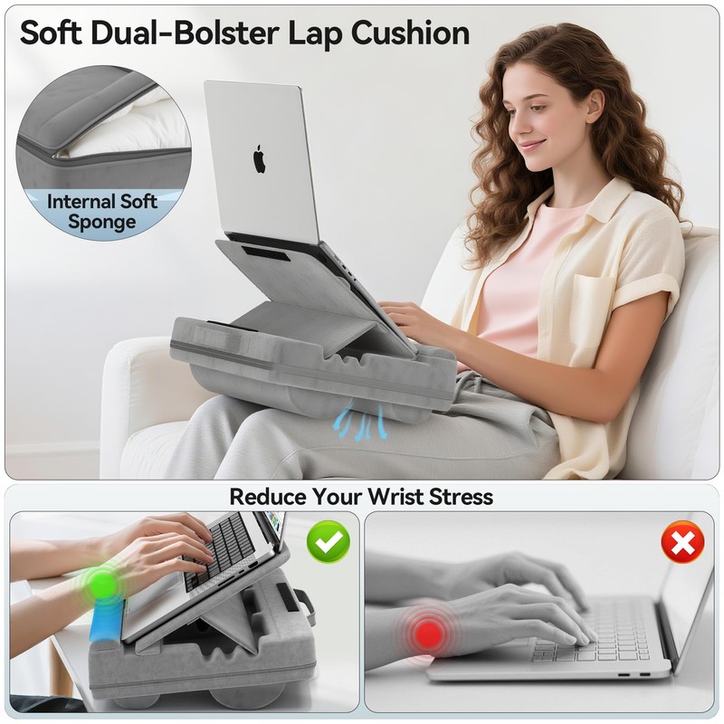 - Comfortable and Durable: This laptop stand for lap is designed with two soft pads of different sizes at the bottom. Not only do they help dissipate heat from your knees, but they also ensure your knees stay comfortable even during extended use. The lapdesk with cushion comes with a detachable wrist rest, secured with Velcro. Soft yet sturdy, it protects and relaxes your wrists at all times while preventing your laptop or other devices from sliding off the support board.