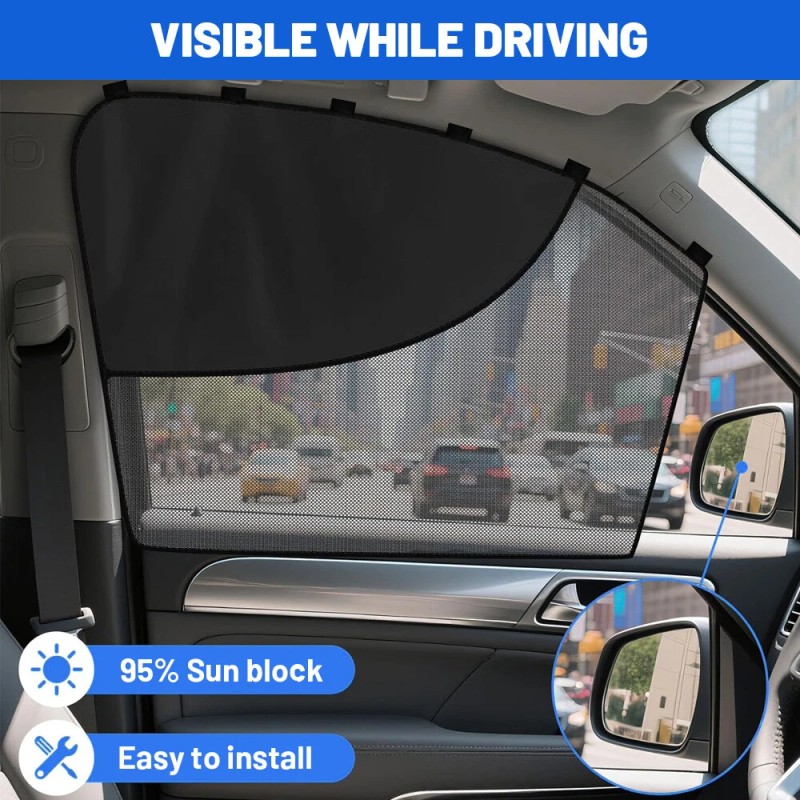【Upgraded Double-layer Design】Our car window shade consists of two layers of cloth, the outer layer is a semi-transparent breathable mesh layer. It blocks 99% of sunlight, heat and UV rays. 【95% Sun Protection】These magnetic sunshades for car windows protect your baby and family and friends from UV rays and strong sunlight. 【Strong Magnet Installation】These car window shades contains 6 strong magnets, which can be firmly fixed to the metal frame of the window or the metal frame of the car body, not easy to fall off. 【Car Window Can Still be Rolled Down】Our car shades for side windows have been carefully redesigned to effectively block the sight of others. 【Universal Fit for Most Vehicle】 Our car side window sun shade is designed to fit most car models (size: 19.69x18.9 inches) .