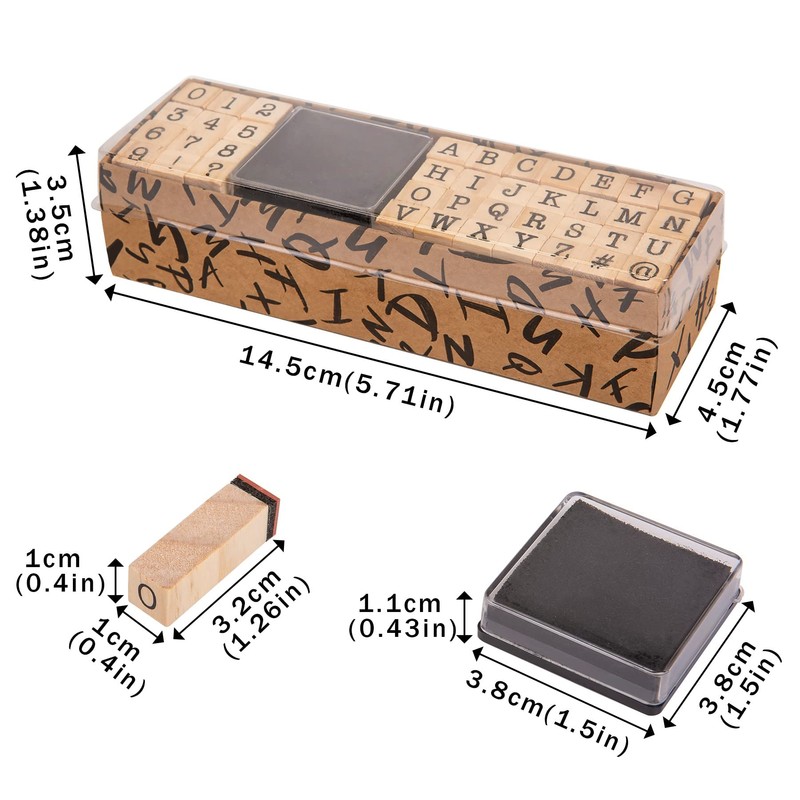 • Package includes: there are a total of 40 wooden stamps, including 26 English capital letters, numbers 0-9, 4 symbols and an ink pad. The size of the box is 14.5 x 4.5 x 3.5 cm, the size of the ink pad is 3.8 x 3.8 x 1.1 cm