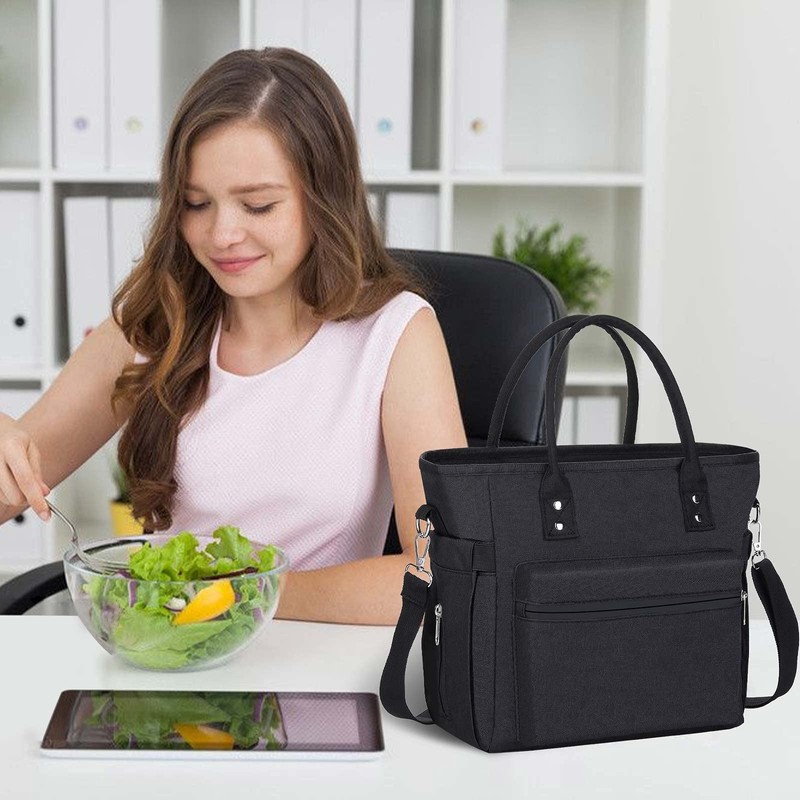 LARCISO Insulated Lunch Bag, Durable Lunch Tote Bag with Adjustable and Detachable Shoulder Strap, Leakproof Lunchbox for Women Men Adults, Thermal Lunch Box Container for Office Picnic Hiking(Black)