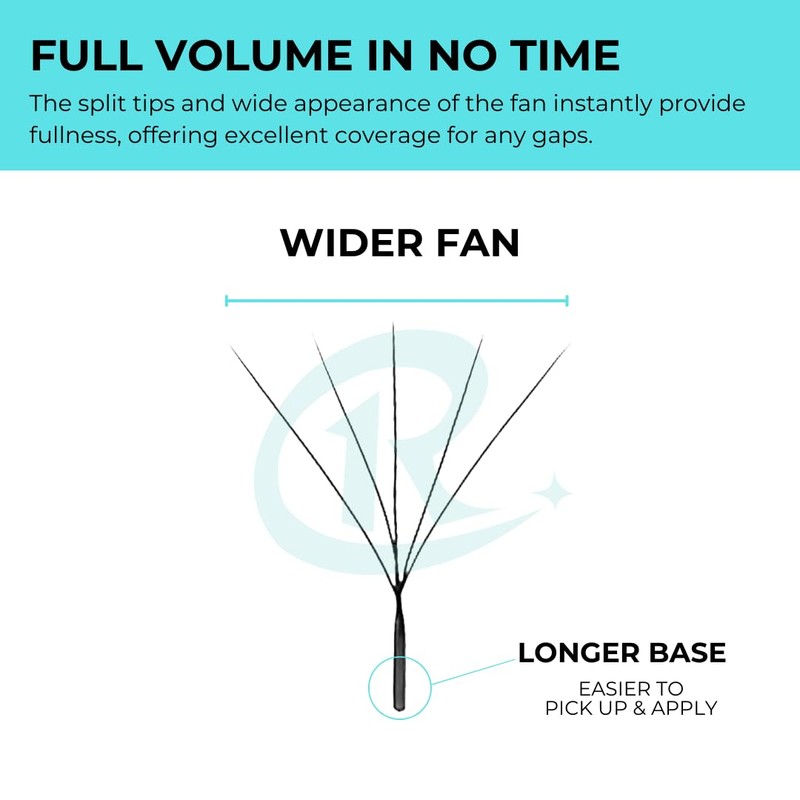 - Full and fluffy volume in no time: These lashes are a game-changer for clients with fewer natural lashes. The split tips and wide appearance of the fan instantly provide fullness, offering excellent coverage for any gaps.