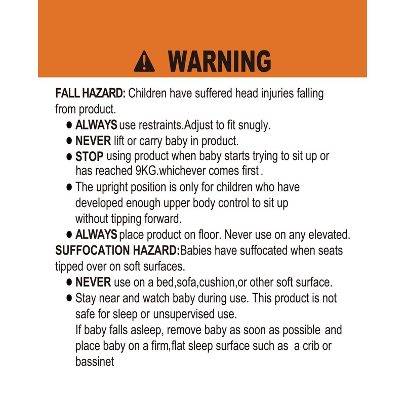 - WARNING: Stay near and watch baby during use. This product is not safe for sleep or unsupervised use. If baby falls asleep, remove baby as soon as possible and place baby on a firm, flat sleep surface such as a crib or bassinet. Never leave infant unattended. Never use on soft surface (bed, sofa, cushion), as seat may tip over and cause suffocation
