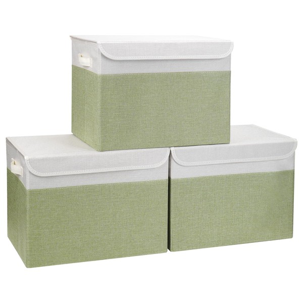 Large 17" 42 Quarts Collapsible Stackable Storage Bins with Lids [3-Pack] Foldable Fabric Linen Storage Boxes Cube, Closet Organizer Baskets with Label for Home (16.7 x 12 x 12, Green & White)