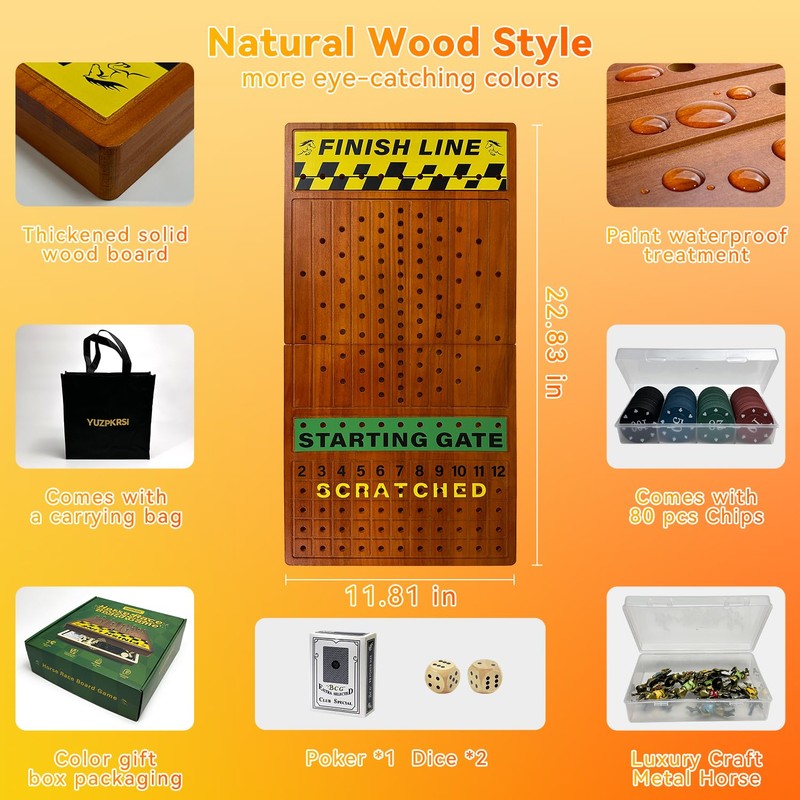 - [Deluxe 23-Inch Wooden Horse Racing Board Game] Crafted from high-quality wood, this large horse racing board game features a double-layered color spray finish that is waterproof and corrosion-resistant. Enjoy a smoother playing surface while indulging in your love for horse racing with the 80 included poker chips during derby parties