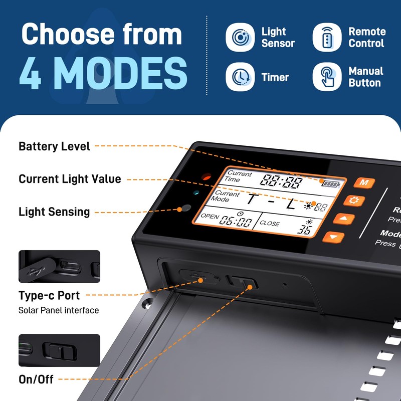 - 4 AUTO MODES: Equipped with a built-in Timer & Light Sensor, the chicken door offers 4 Auto Modes (TT/LL/TL/LT) for setting automatic open and close. They free you from early-morning and late-night routines, allowing for peaceful sleep and hassle-free outings. You can also remote control or manual operation.