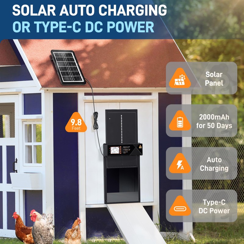 - SOLAR CHICKEN COOP DOOR: The automatic chicken coop door provides 3 Power Supply Modes: Solar Power, Plug Adapter, and Built-in 2000mAh Battery. The fully charged battery serves as a reliable backup for 50 days, ensuring continuous operation without concern for weather conditions, power outages, or difficult electrical access.