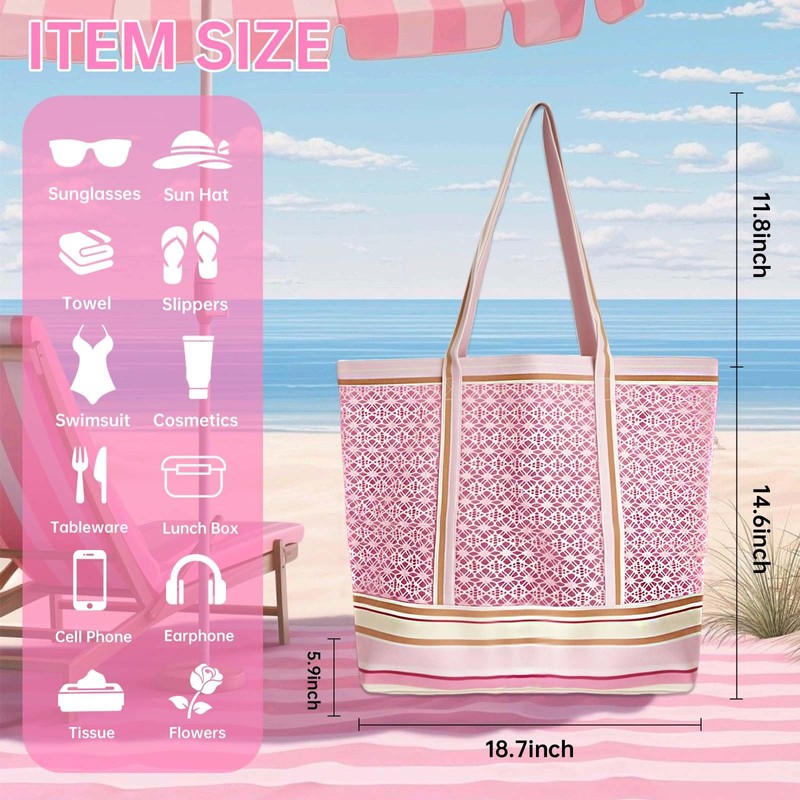 Large Beach Tote with Zipper - Lightweight Mesh Bag for Women, Beach/Picnic/Travel, Detachable Pouch, 18.7”x14.6” (Pink)