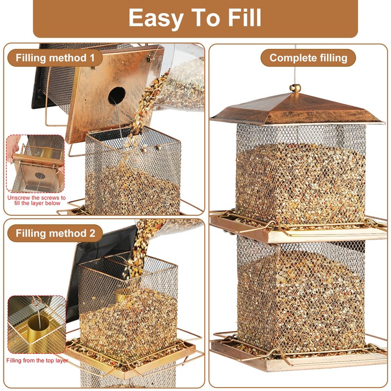 - EASY TO VIEW: The bird feeder container part is designed with welded metal hollow mesh, allowing you to directly see the bird food stock and replenish it at any time.