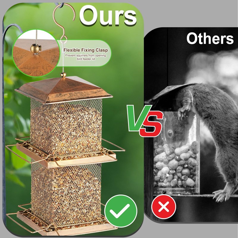 - FUNCTIONAL DESIGN: The lid of the bird feeder is designed with anti-squirrel snaps, when filling the bird feeder, just open the snaps to remove the top of the feeder and fill the bird feeder easily.