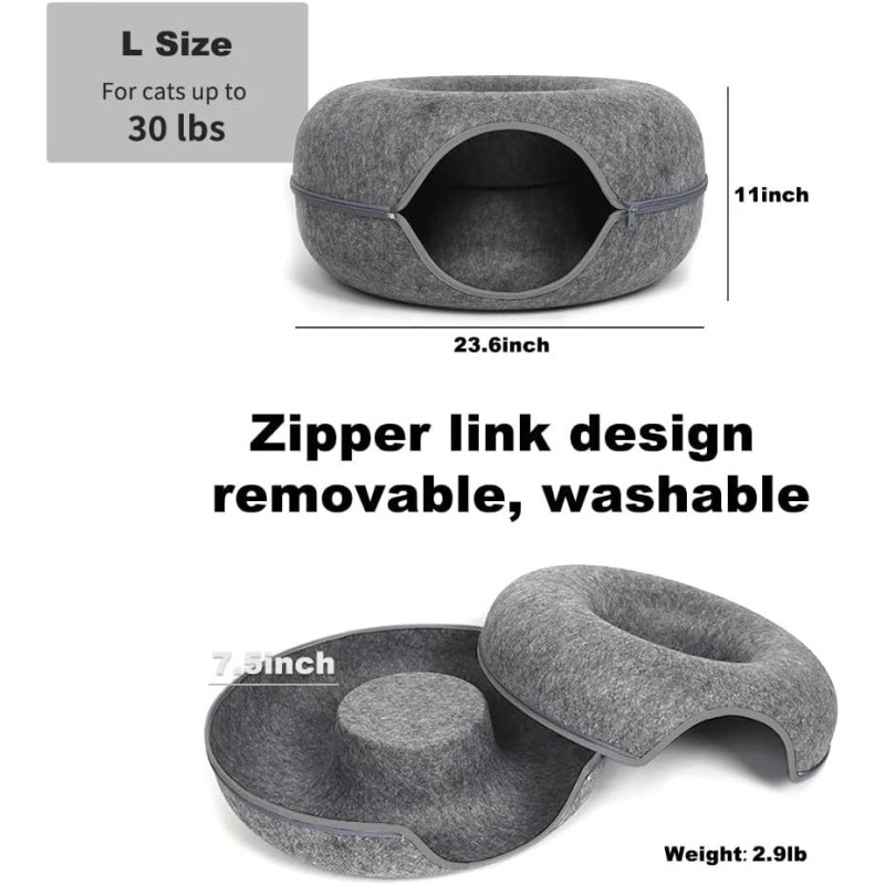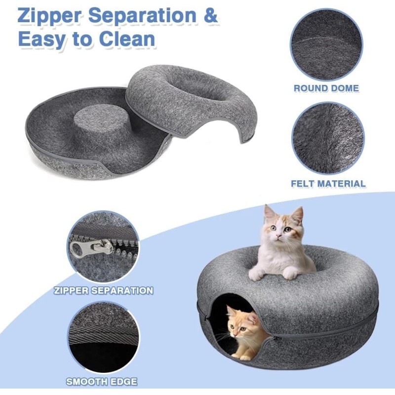 • Collapsible, Available in All Seasons: The cat tunnel bed for indoor cats consists of only felt and a zipper, which is strong, scratch-resistant, non-pilling and safe for your furry babies. The cat bed is detachable and washable (not machine washable), and can be used in all seasons