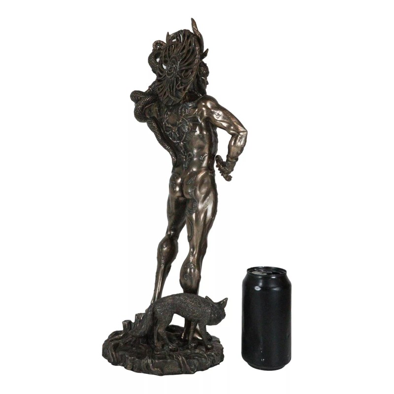 • This is a breathtaking depiction of Cernunnos the Celtic Wiccan Forest Horned God. He holds a horned python on one hand, Torc of Power behind his head and on his neck, and a sly fox as his messenger. This sculpture is the work of the famous Gothic Fantasy artist Maxine Miller. Own one for yourself today or gift it away!