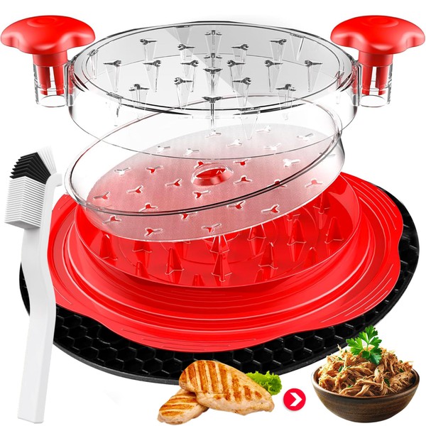 Large Chicken Shredder Tool Twist โ BPA-Free Meat Shredder with Visible Lid, Anti-Slip Base, Ergonomic Handle with Brush for Easy Cleaning and Quick Shredding of Chicken, Beef, & Vegetables (Red)
