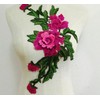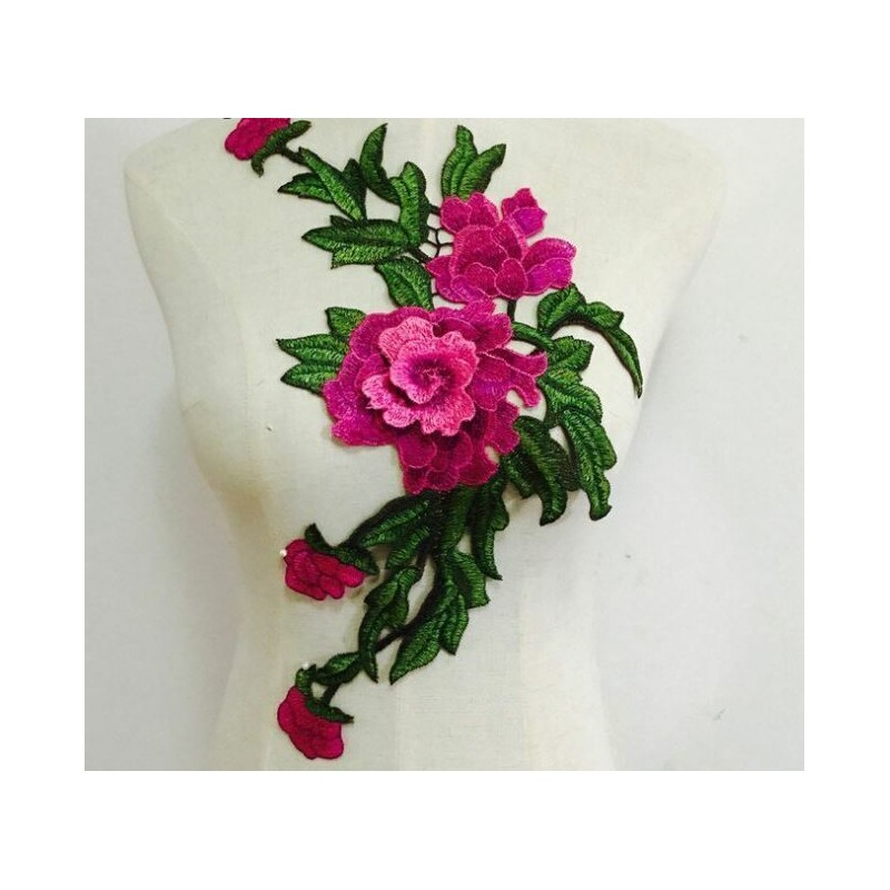 Large Fuchsia Green Embroidered 3D Applique Flower Patch Sew On DIY Leaf Vine