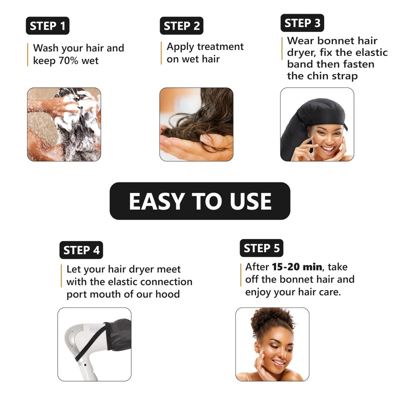 • Convenience and Comfort in Use: Our hair dryer cap is designed for ease of use, featuring a satin diffuser cap with an adjustable drawstring and a chin strap to accommodate various ages and sizes. Lightweight and hands-free, it simplifies your morning routine.