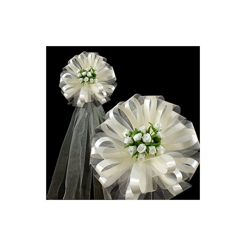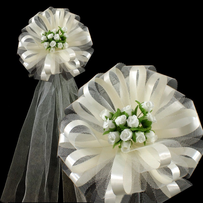 - Full and fluffy with an abundance of ribbon loops, long tulle streamers, and ivory rosebuds, these wedding bows will add a truly romantic touch to your special day