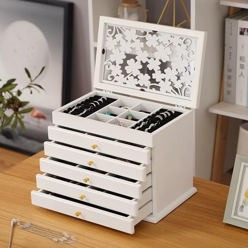 Are you still worried about losing your jewelry? Do you have too much jewelry without a big enough storage box? If you answered yes to these questions, then you should not miss this six-layer jewelry box. The six-layer storage design allows you to store many different kinds and sizes of jewelry. Its smooth lines and unique carvings reveal a delicate elegance. It will be a unique organizer for all your beautiful jewelry.