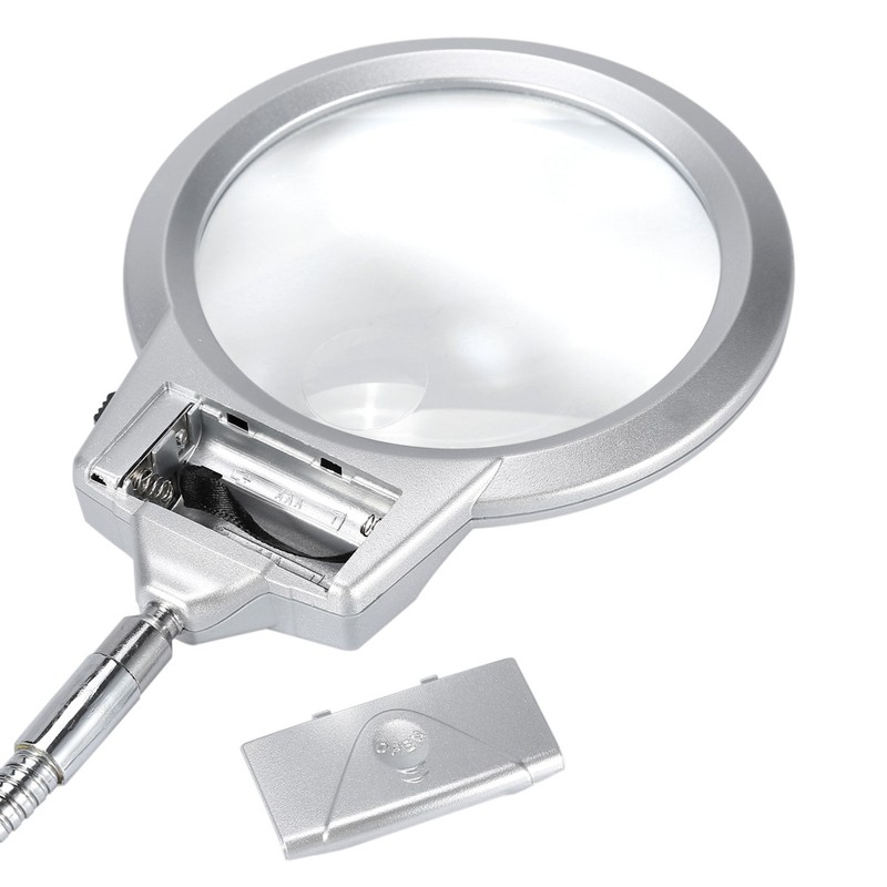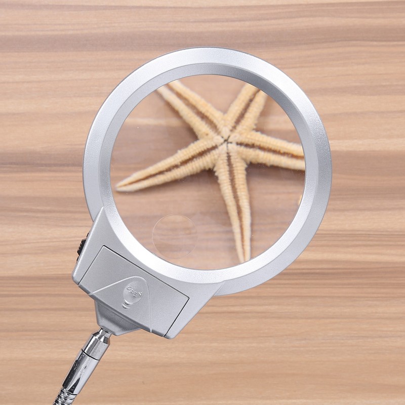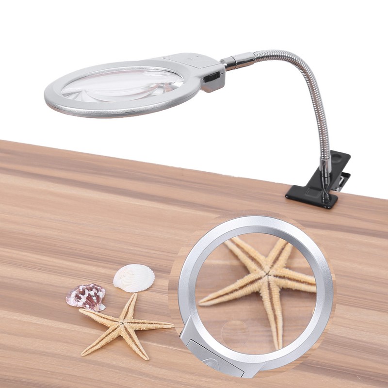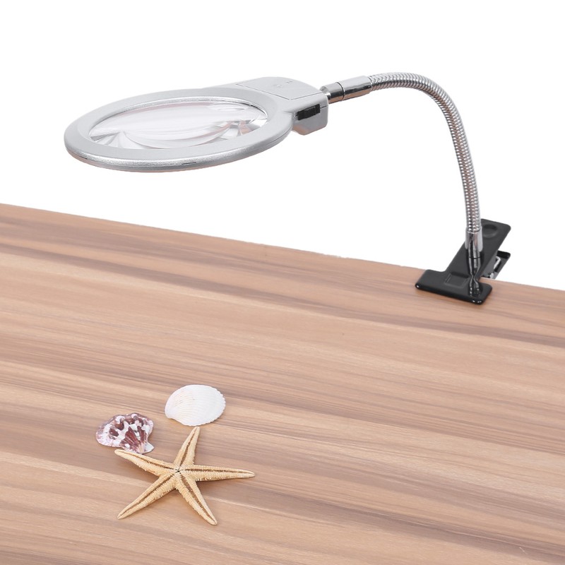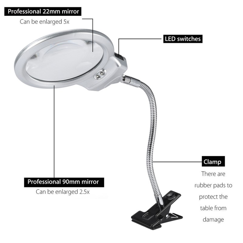1、Soft metal hose can be bent freely at any different angles to adjust lens' height and position and meet your different needs 2、Ideal for people who are involved in fine work such as coins, stamps, jewelry, embroideries and so on 3、2 magnifiers with 2.25x and 5x magnification allow you to get an extremely close view of the tiniest details 4、2 led lights ensure you can work under insufficient light environment 5、Lens frame can protect the lens from damaged for long time use