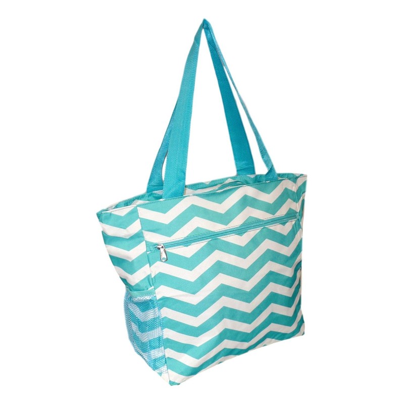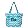 Large Multi - Pocket Fashion Zipper Top Beach Bag Tote - Custom Embroidery Available (Aqua Chevron Embroidery Name)