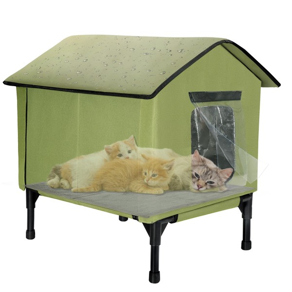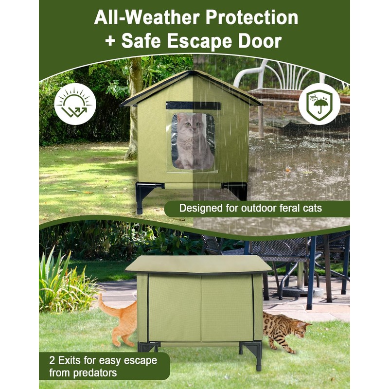 - SAFETY FIRST: This waterproof cat house features 2 exits for easy escape from predators and includes removable PVC door flaps to protect your furry friends from the harsh outdoor elements.